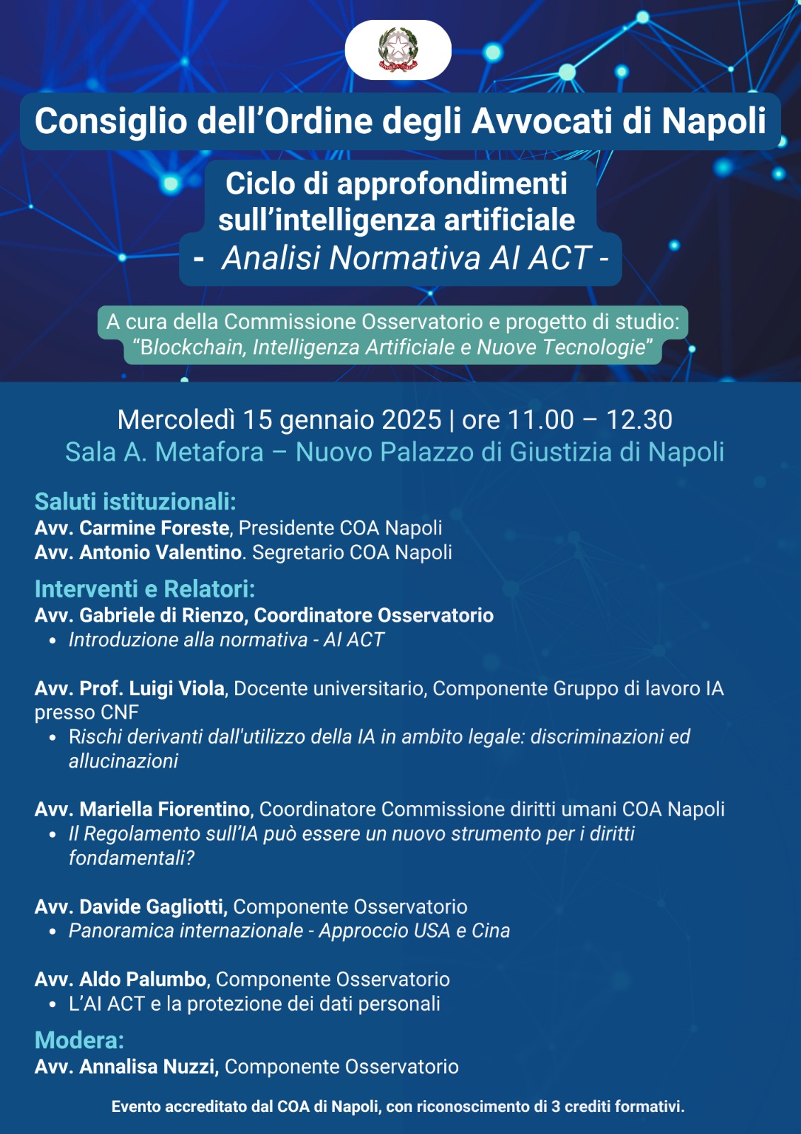 E’ tutto pronto a Napoli per il secondo dei tre eventi del “Ciclo di approfondimenti sull’intelligenza artificiale”, intitolato “Analisi Normativa Al ACT” e organizzato dalla Commissione Osservatorio e Progetto di studio “Blockchain, Intelligenza Artificiale e Nuove Tecnologie” del Consiglio dell’Ordine degli Avvocati di Napoli. L’iniziativa si terrà il prossimo mercoledì 15 gennaio 2025, a partire dalle ore 11 alle ore 12.30 presso il Nuovo Palazzo di Giustizia di Napoli nella sala A. Metafora. Parteciperanno autorevoli esperti nel settore, tra gli altri, l’Avvocato Luigi Viola, Docente universitario, Componente Gruppo di lavoro IA presso CNF; l’avvocato Mariella Fiorentino, Coordinatore Commissione diritti umani COA Napoli; e gli avvocati e componenti della commissione organizzatrice Davide Gagliotti e Aldo Palumbo.