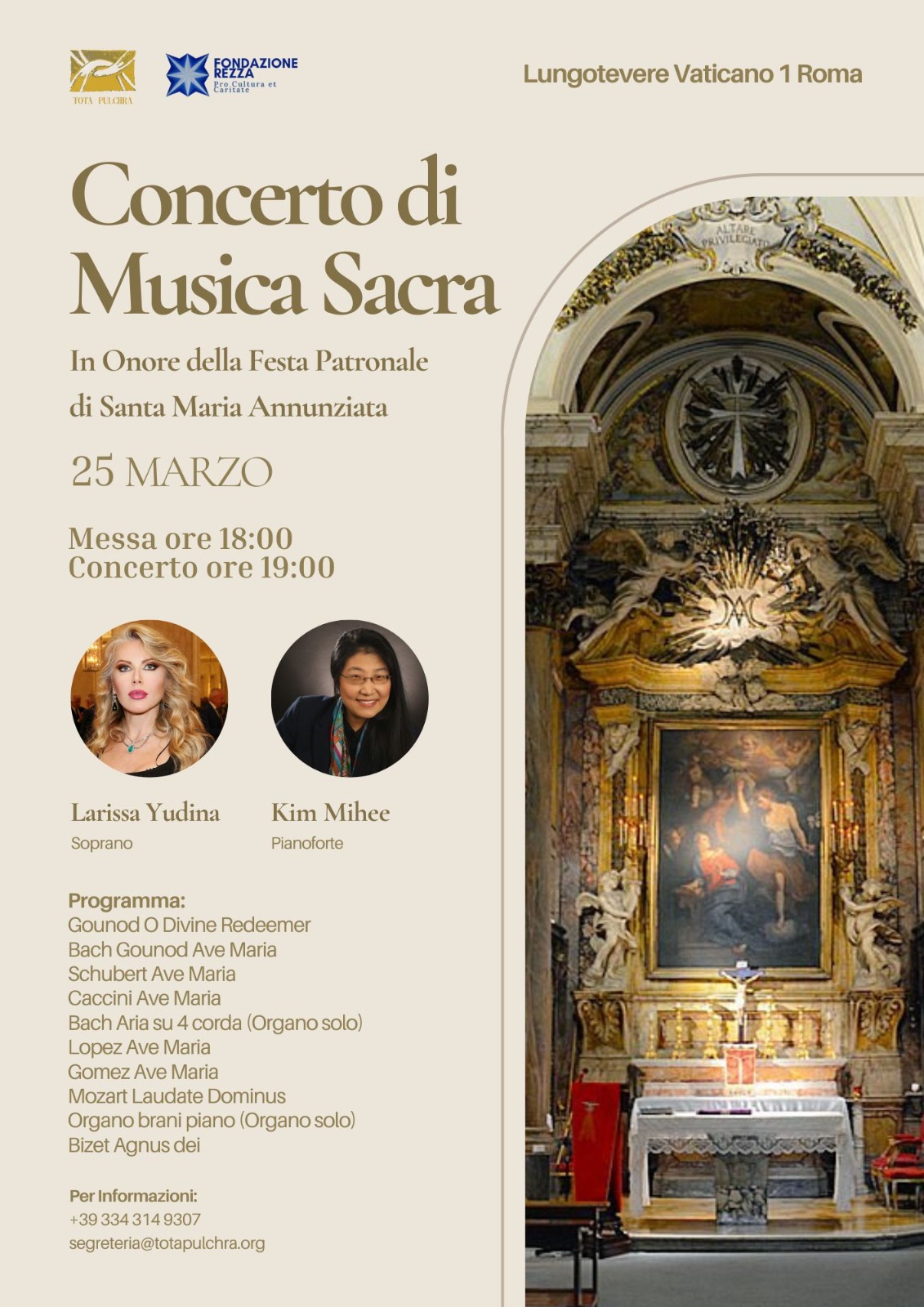 Siamo lieti di annunciare il Concerto di Musica Sacra, che si terrà il 25 marzo 2025 presso Lungotevere Vaticano 1, Roma. L’evento inizierà con la Messa alle ore 18:00, seguita dal concerto alle ore 19:00. Il concerto vedrà la partecipazione del soprano Larissa Yudina, un’artista di talento, accompagnata al pianoforte da Kim Mihee.