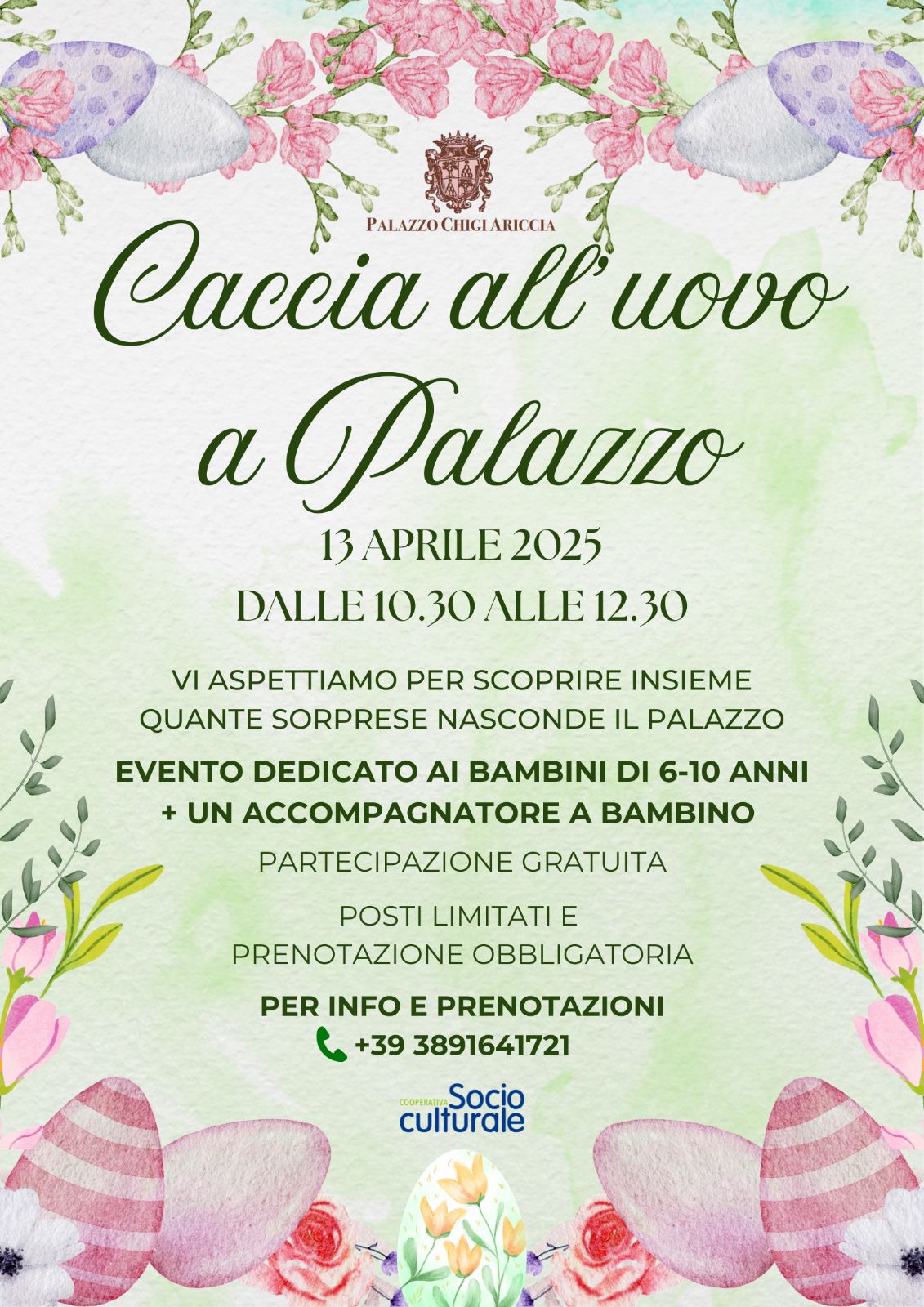 Domenica 13 aprile, dalle 10:30 alle 12:30 si svolgerà presso le sale del Palazzo Chigi ad Ariccia, l’evento “Caccia all’uovo a palazzo”, dedicato ai bambini dai sei ai dieci anni.