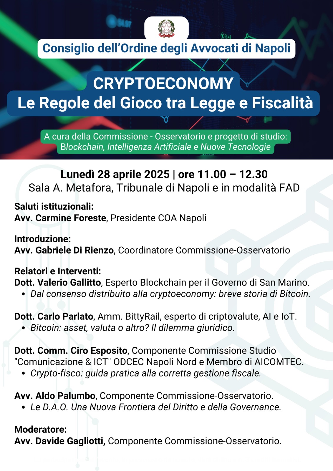 “Il mercato delle criptovalute e la tecnologia blockchain stanno rivoluzionando il settore finanziario e giuridico. Questa evoluzione pone nuove sfide in termini di regolamentazione, fiscalità e governance. Per analizzare questi aspetti chiave, la “Commissione – Osservatorio e progetto di studio Blockchain, Intelligenza Artificiale e Nuove Tecnologie”, organismo del Consiglio dell’Ordine degli Avvocati di Napoli, promuove l’evento “Cryptoeconomy: le Regole del Gioco tra Legge e Fiscalità”, in programma per il prossimo lunedì 28 aprile 2025, presso il Tribunale di Napoli (Sala A. Metafora), a partire dalle ore 11. All’evento è prevista la partecipazione di autorevoli personalità: si partirà con i saluti istituzionali dell’ Avvocato Carmine Foreste, Presidente del Consiglio dell’Ordine degli Avvocati di Napoli e con l’introduzione dell’Avvocato Gabriele Di Rienzo, coordinatore della Commissione-Osservatorio organizzatrice.